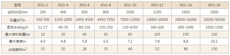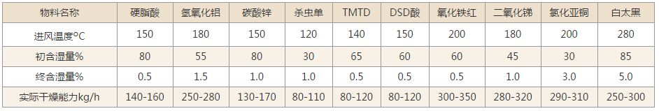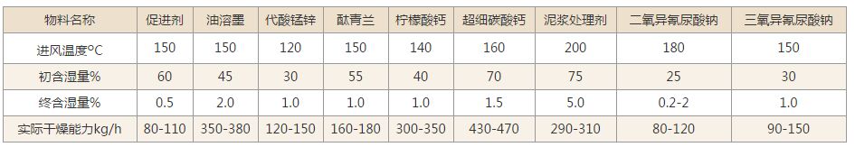 注:1.水分蒸發(fā)量是以進(jìn)風(fēng)溫度為180oC,出風(fēng)溫度為80oC 時(shí)每小時(shí)蒸發(fā)的水份,